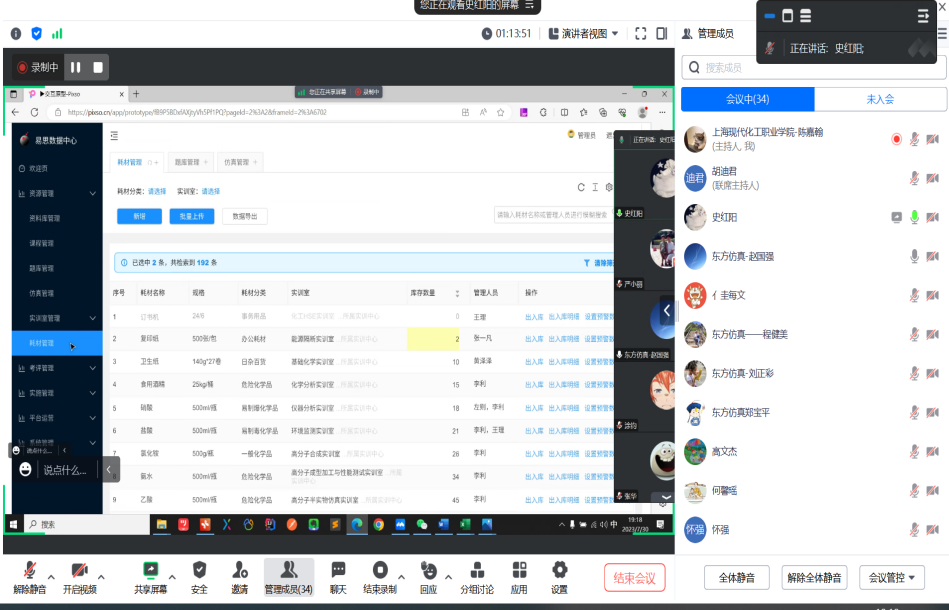 史红阳继续对资源管理和共享子系统进行了介绍,该系统中实训室管理根据目前现在的实训室记录纸质版数据导入到平台中,可以完成实训室管理和实训室设备管理和耗材管理,具体包括领取和归还的台账,线下审批,输、入库和领用、退还等并且支持批量导入。张华专家指出,作为具有危化品的管理平台,需要提高平台监控质量,增加输入字段和筛选条目。