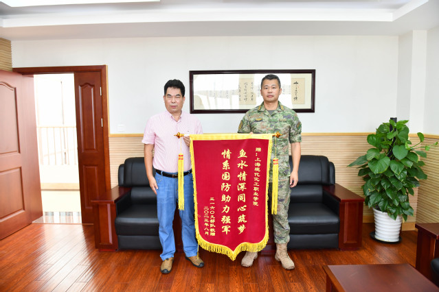 8月17日,中国人民解放军31609部队副政委陈剑锋和后勤科长吴忌二人为我校送来题有“鱼水情深同心筑梦,情系国防助力强军”的锦旗,感谢我校在部队暑期拉练中的支持与贡献。校长陈晓斌代表学校接受锦旗。