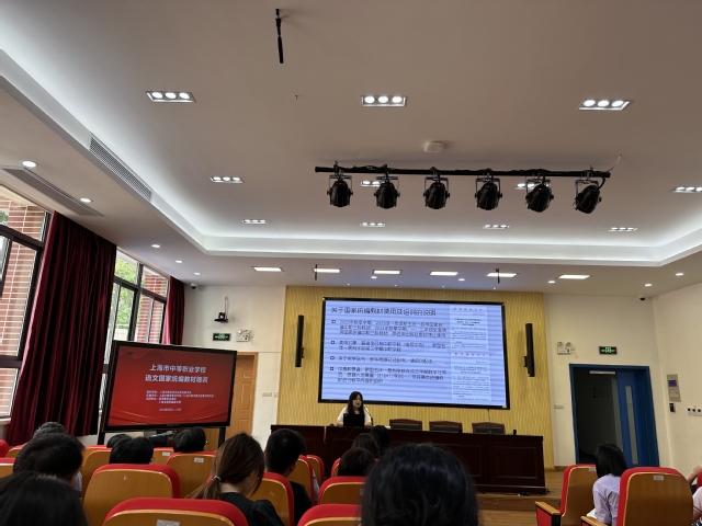 上海市教研室教研员应宏芳老师在开班首日为培训班作了题为《关于国家统编教材使用及培训的说明》的讲座。从中职语文统编教材编写依据、编写思路、内容框架、总体特色、教学建议等方面做了提纲挈领又高屋建瓴的讲解。