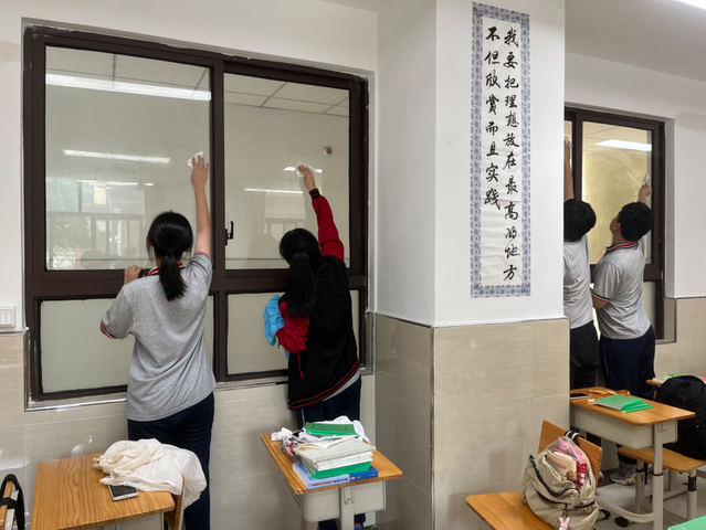 调整座位,发教材,出黑板报,大扫除,班会,报到日当天的工作繁忙而有序地进行。考虑到高复学生已是中职三、四年级的学生,自主意识较强,班主任尊重他们对座位的自主选择,略作调整;领教材,发教材,自是男同学一马当先;出黑板报,三位女同学虽来自不同班级,第一次合作,却和谐而高效;教室内外全面清扫,分工明确人人有责。