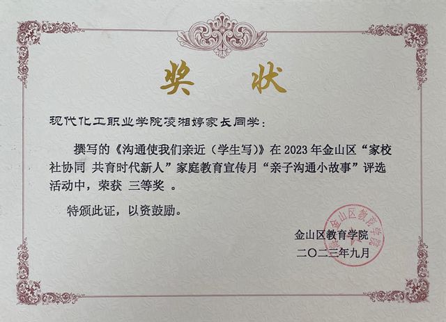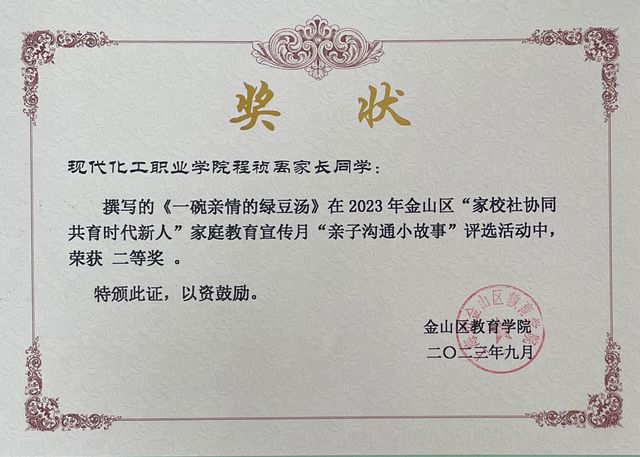 在刚刚闭幕的2023年金山区“家校社协同,共育时代新人”家庭教育宣传月活动中,我校两位学子在“亲子沟通”主题征文活动中获奖,程祯禹同学及家长撰写的《一碗亲情的绿豆汤》荣获二等奖;凌湘婷同学及家长撰写的《沟通使我们亲近》荣获三等奖。