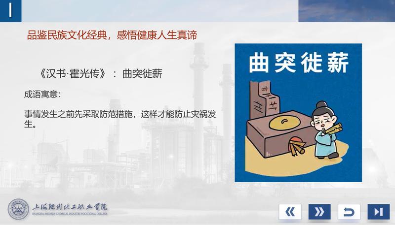 首先,王辉老师以“品鉴民族文化经典,感悟健康人生真谛”的内容开启了今天的课程教学。让同学们通过了解成语“曲突徙薪”的典故,引发学生思考,体会其中蕴含的“预防为主,本质安全”的理念。然后由古论今,介绍巴斯夫公司“健康至上”的企业文化,感受世界先进化工企业的价值核心理念。