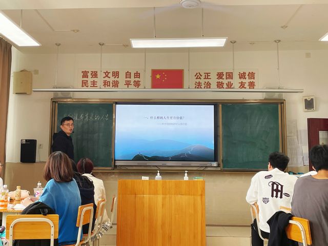 首先王老师回顾了上节课学习的内容,指出要勇敢面对和处理各种人生矛盾,从而实现有意义的人生,顺利导入本课。学习人生价值的评价尺度,王老师引导学生展开了积极讨论,最后师生共同总结出评价人生价值的根本尺度,是看一个人的实践活动是否符合社会发展的客观规律,是否促进了历史的进步。学习人生价值的评价方法,王老师分别了列举了我校优秀毕业生陈佳美以及杭州亚运会冠军王楚钦、孙颖莎,选取的案例贴近时代,贴近生活,学生参与度高。最后学习如何抵制错误价值观,王老师采用了翻转课堂的模式,四个小组同学代表分别就当前存在的错误价值取向进行了一一阐释。小组代表们指出错误的思想观念容易侵蚀大学生的心灵,不利于大学生树立高尚的人生观。大学生要学会思考、善于分析、正确抉择,树立正确的人生观,从而创造有意义的人生。