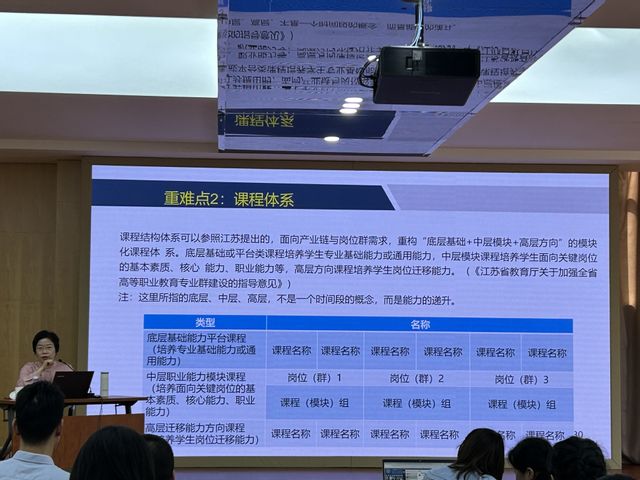 高水平专业群建设过程中群内跨专业协同教学团队是创新关键。最后,朱教授针对国家级高等职业学校职教创新团队指标体系展开分析,包括建设载体、建设基础、团队水平、建设方案和保障措施五项内容。在实践经验基础上,她总结高水平专业群建设与教师创新教学团队实施的重难点主要是产业定位、课程体系、教材建设和人才培养模式四点。产业定位最终必须落脚到就业岗位和能力清单;而课程体系构建需要依据面向产业岗位的能力分析,反映产教映射关系,又体现能力本位;教材建设的重点则是解决陈旧老化的问题,及时将新技术、新工艺、新规范纳入教材;人才培养模式的考量则需贯彻能力本位、对接工作过程、体现任务引领。