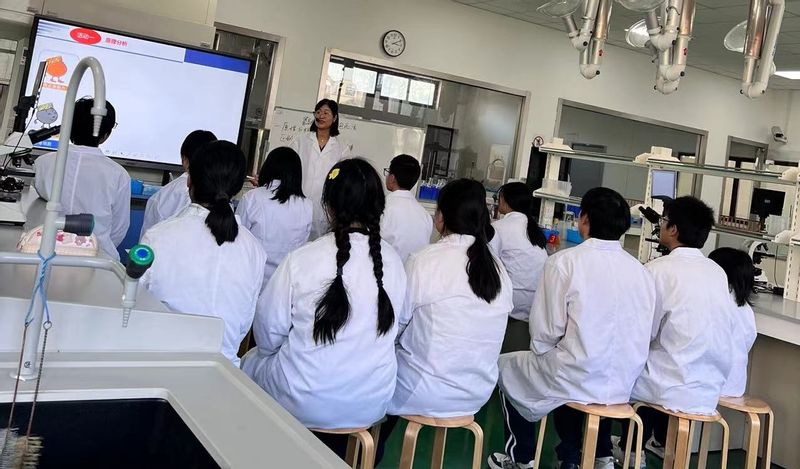 课程伊始,路老师以一袋未开封的酵母粉引入教学新课,在实际的教学情境中渗透生活化内容,激发学生学习兴趣,有助于强化科学课程内容的生动性、直观性。课程设置三个教学活动:原理分析、制作酵母美兰染液水封片并镜检以及镜检结果展示贯穿课堂。在原理分析部分,路老师注重教学引导,循循善诱,以微观动画帮助学生理解鉴别原理;实验制作酵母美兰染液水封片并镜检部分是本节课重点内容,路老师通过教学演示帮助学生规范实验操作,建立操作体系,学生随后分组实验,用光学显微镜观察结果,充分感知科学课程的魅力。镜检结果展示部分,通过希沃大屏清晰展示学生的观察结果,便于学生对比发现共同现象,总结实验结论。