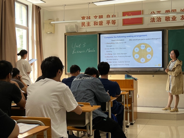 本堂课虽然是阅读课,但是在铁老师的指引下,学生不但掌握了基本的字词句,而且还体会到了商务礼仪和餐桌文化的重要意义。整堂课学生互动积极,教学效果良好,得到了听课老师的一致认可。