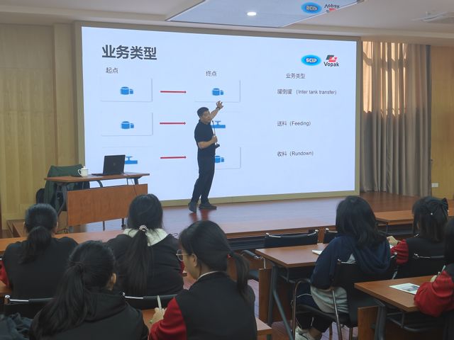 接着,干杰为同学们清晰明了地讲解了液体化工品收发的业务类型、客户服务、送料,收料操作等内容,其中业务类型有罐倒罐、送料、收料、管线直接装卸船等;客户服务有确认订单流程、订单接收、标签管理、投诉管理、车辆预约管理等。干杰给同学们直观展示了液体化工品收发的各项流程,并且通过举例,让同学们理论联系实际,印象深刻。