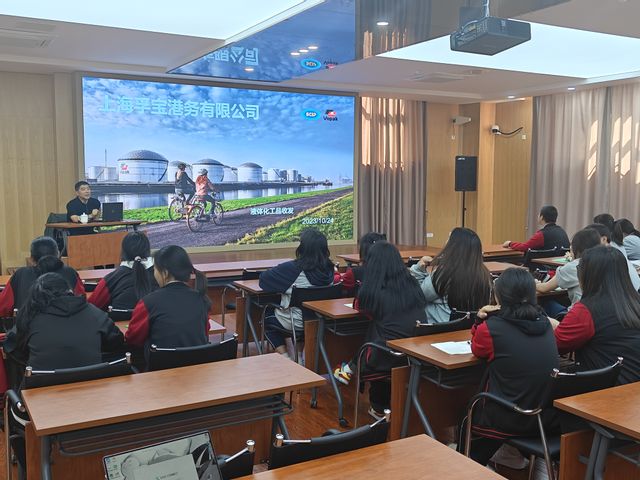 首先,干杰进行了自我介绍和企业介绍。上海孚宝港务有限公司由荷兰皇家孚宝公司与上海化学工业区发展有限公司合资组建,坐落于上海化学工业区。经营范围包括建设、管理和经营上海化学工业区内化学物品专业码头及其相关的贮存装运设施,为上海化学工业区及其周边企业,提供化学物品进出贮运及其物流服务。其中干杰详细介绍了上海化学工业区的漕泾分部的情况和战略功能,带领学生们了解化工物流企业,认识化工物流的行业特点,拉近企业与学生的距离。