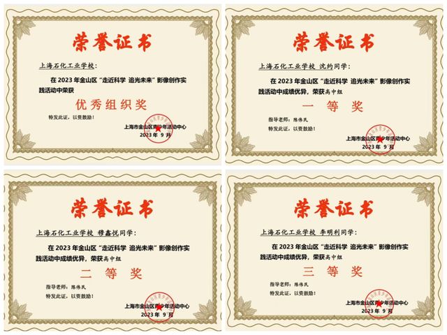 在日前揭晓的上海市第十三届青少年摄影创作实践活动的获奖结果中,上海现代化工职业学院经贸学院201物流班沈约,穆鑫悦,李明利,顾丽雯四位同学,在陈伟民老师和凌朝晖老师的指导下,在高中组一举夺得7个奖项,其中区级一等奖、区级二等奖、区级三等奖各一个,获奖等级与数量为金山区高中组第一名,学校也因此获得了优秀组织奖。同时更斩获了一个上海市二等奖和两个上海市三等奖,在获奖的数量上为上海市高中组并列第一名。