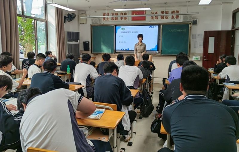 周红老师用一听铝罐雪碧的图片,手举一盒铝盖的小核桃实物引出了本次课的主题——铝合金,别出心裁的开场白和有趣的实物立刻吸引了学生眼球,提起了学生的学习兴趣;随后周红老师又引用国产C919飞机试飞的视频来说明生活、工程中铝合金的广泛应用,并以生产C919飞机的事例宣传我国制造强国的战略,适时引导学生立志为制造强国担当历史使命。紧接着,顺势而为,周老师设计为国产C919飞机零部件选铝合金材料的学习任务,由用定学,围绕为国产C919飞机选材,先选后检,边讲边练,逐步推进认识铝合金的分类、牌号及应用的教学内容。整堂课,结合生活、契合工程、递进剖析,学生表现出求知的好奇心,周老师用生动有趣的举例,让学生在欢声笑语中学到知识。本次课另一特色是思政育人,自然流畅、由表及里,有感染力有深度。如用一听铝罐雪碧图片淡出到出现回收铝罐的图片,自然而然带出保护环境、节约资源的号召;课堂最后播放天舟5号货运飞船发射视频,飞船腾空而起视觉震撼的同时,出现“天舟5号承载着中华民族伟大复兴的强国梦而腾飞!”配音解说和“为中国航天点赞”的字幕,与课堂开始国产C919飞机试飞的视频思政教育首尾呼应、逐步深入。