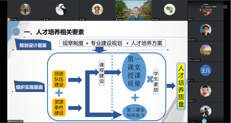 首先,他从人才培养的相关要素出发,进行了系统的分析。在规划设计层面,他详述了规章制度、专业建设规划和人才培养方案。而在组织实施层面,重点关注了师资队伍建设和资源条件建设,旨在进一步提高人才培养的质量。