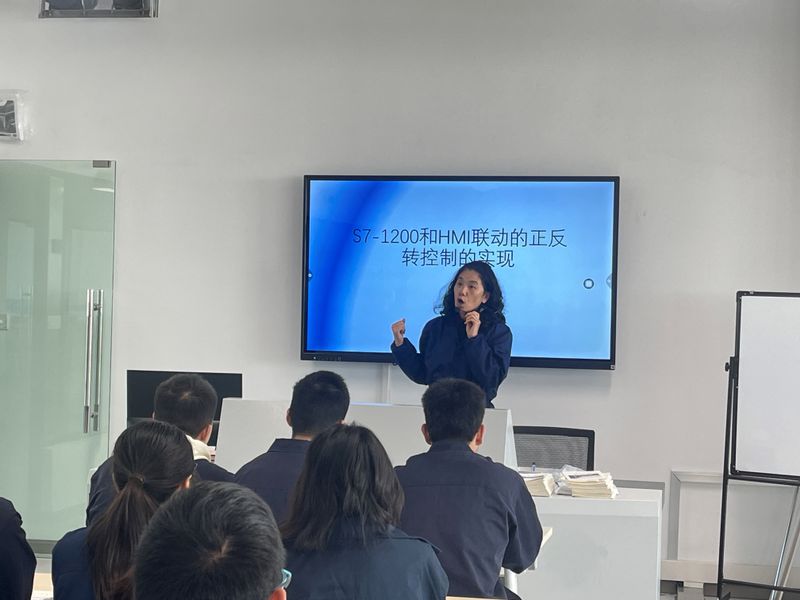 课中金花老师以西门子编程为着重点,从小组讨论完成变量表开始,逐步递进,最终小组完成PLC编程及仿真运行。然后金花老师下发了变频器的参数和触摸屏的布局要求,有个小组自行完成,最后各自展示学习成果。