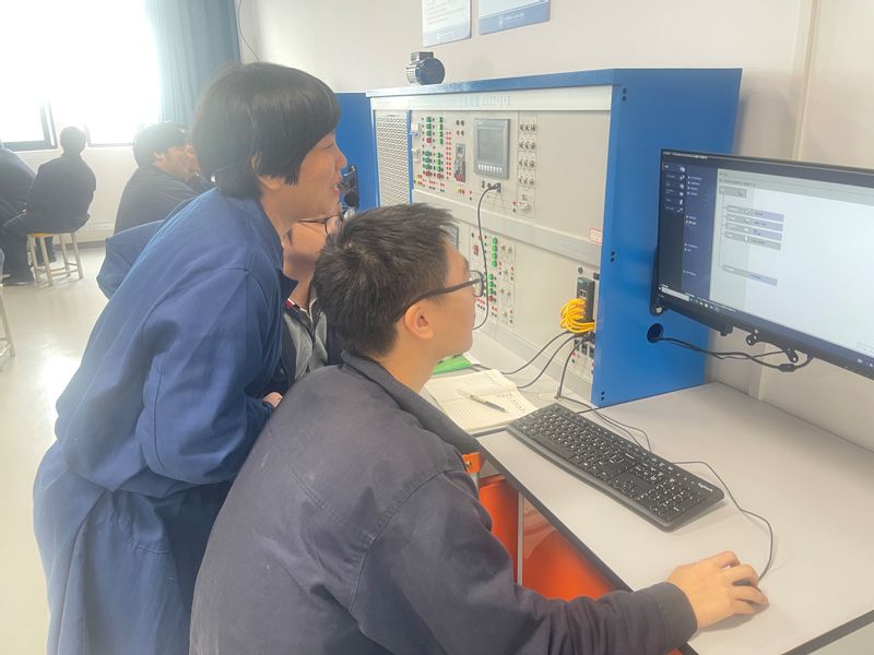 阮禕老师掌握了学生前期所学知识后,大胆要求同学独立完成学习任务,期间把整个学习项目分为接线、编程、变频器参数设置、触摸屏布局几个阶段,每阶段完成后让同学相互检查,评价,通过互查互评的过程,再一次提升能力学生的学习能力,培养了学生严谨的工作态度。学生们在实训课程的过程中,态度积极,受益良多,真正体会到了知识与实践的结合。