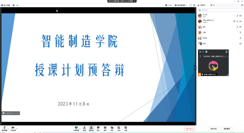 为进一步提升广大教师对课程设计的理解,高质量做好教学文件撰写工作,学校组织开展了2023年度授课计划答辩活动。根据教务总体部署及要求,智能制造学院于11月8日晚上八点开展了预答辩工作。预答辩由智能制造学院院长吴敏主持,参与正式答辩的四位教师臧欢、刘曼、周伟倩、王小莉分别针对自己的课程进行汇报。
