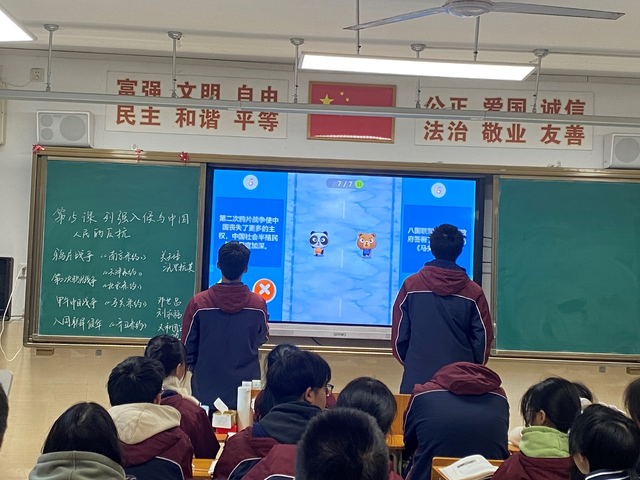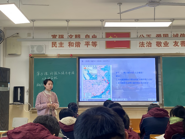 课堂上,王颖老师以三个探究为主线,探讨了系列侵略战争对中国社会带来的影响、中国人民进行顽强的抗争意义以及列强侵华趋势特点,全面深刻地向学生揭示了晚清中国社会内忧外患的局面,特别是以《辛丑条约》签约图与2021年中美外交会晤作对比,让学生在交流中感悟“弱国无外交”,国家的繁荣强盛是每一个中国人民最坚实的依靠,激发学生强烈的爱国主义情怀和“吾辈当自强”的社会责任感、民族自豪感。