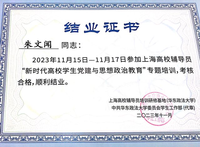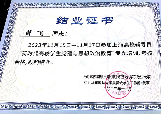 为深入学习贯彻习近平新时代中国特色社会主义思想和党的二十大精神,全面贯彻落实习近平总书记关于教育的重要论述,更好落实立德树人根本任务,深入实施“时代新人铸魂工程”,全面提升高校辅导员素质能力,上海高校辅导员培训研修基地近日在华东政法大学举办了“新时代高校学生党建与思想政治教育”专题培训班。来自上海40多所高校、近百名辅导员参与了专题培训班,我校朱文闻和薛飞两位辅导员老师参与培训。