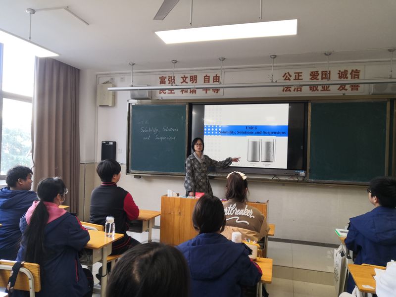 为进一步践行新课程标准精神,提高教师教育教学水平,促进教师相互学习、相互交流,充分展示教师课堂风采,11月27日下午第5节课,化学工程学院的孔慧老师在211巴斯夫班开设了一堂以《Solubility,Solution and Suspension》为主题的公开课。胡耀华、李娟、陈湘玲等老师前往听课。