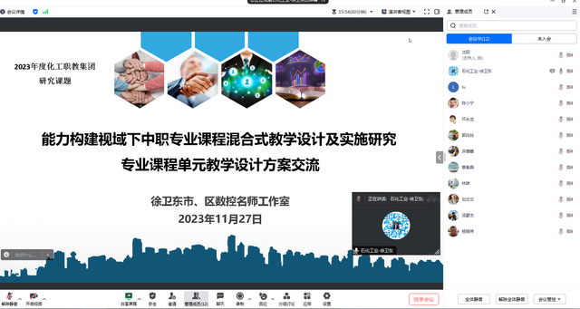 11月27日,徐卫东市、区两级名师工作室在线上联合举行了《2023年上海化工职业教育集团研究课题--能力构建视域下中职专业课程混合式教学设计及实施研究》线上线下混合式教学设计方案交流分享会,会议由徐卫东老师主持。全体课题组成员,来自徐卫东名师工作室的市级成员和区级成员从不同角度分享了线上线下混合式教学的设计、实践及体会。