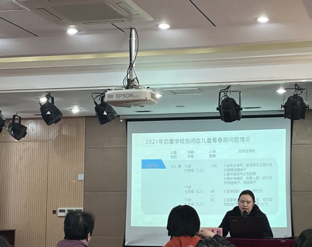 随后,启星学校王晨韵老师分享了一例自闭症儿童青春期问题行为的干预个案。王晨韵从个案背景、问题行为表现、相关干预措施几个方面逐一讲解,让在座的老师非常直观地了解青春期问题行为干预的方法和策略。
