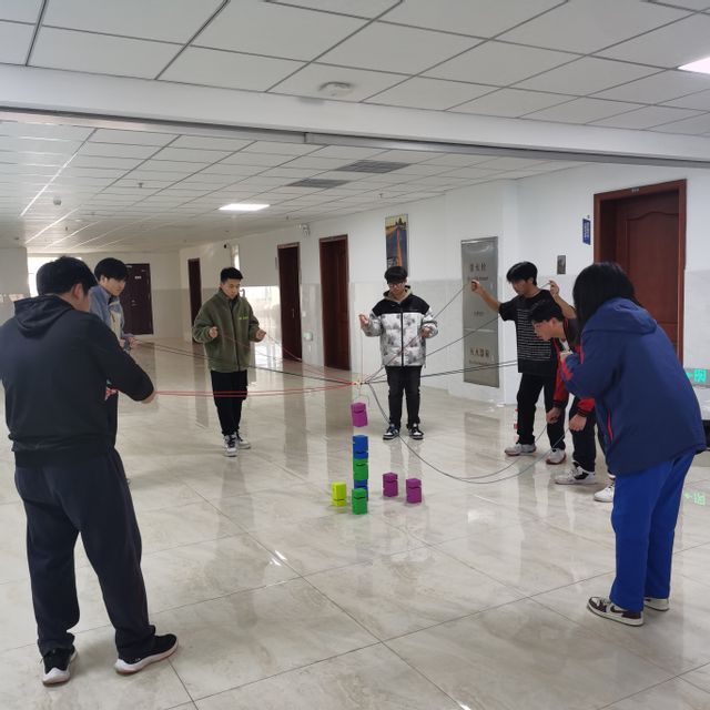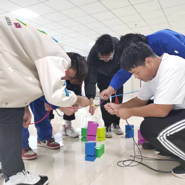 在合力建塔过程中,只见学生们屏气凝神,将一根根拉紧的绳索缓缓移动着,控制着塔钩将一块块塔吊起并,在大家的协作下吊起相应的基础板块并按照任务搭高起来。合力建塔的规则看似简单,游戏从安装开始计算时间,但学生们需要协作通过控制吊板,进行积木叠加操作。这个过程中,如果不小心出现掉落的情况,需要在起点重新摆好,重新开始。