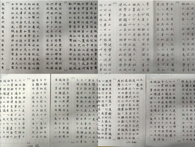 不同于往届选手自选书写内容的决赛规则,今年的硬笔书法决赛由老师提供书写样板,学生以临摹的作品方式参加竞赛。这样,把鉴赏和比赛有机结合起来,通过观察赏析和临摹捕捉书法细节,提高书写技能,提升鉴赏水平。同时,通过学习与临摹精选名家名篇的诗文书法作品,也在潜移默化中增加了学生的文学储备,提升了文化底蕴。在本次决赛中,我们也惊喜的发现了不少优秀的书法作品。同学们通过一次次训练和比赛,赛出了自己的水平和风格,让人甚为欣喜。