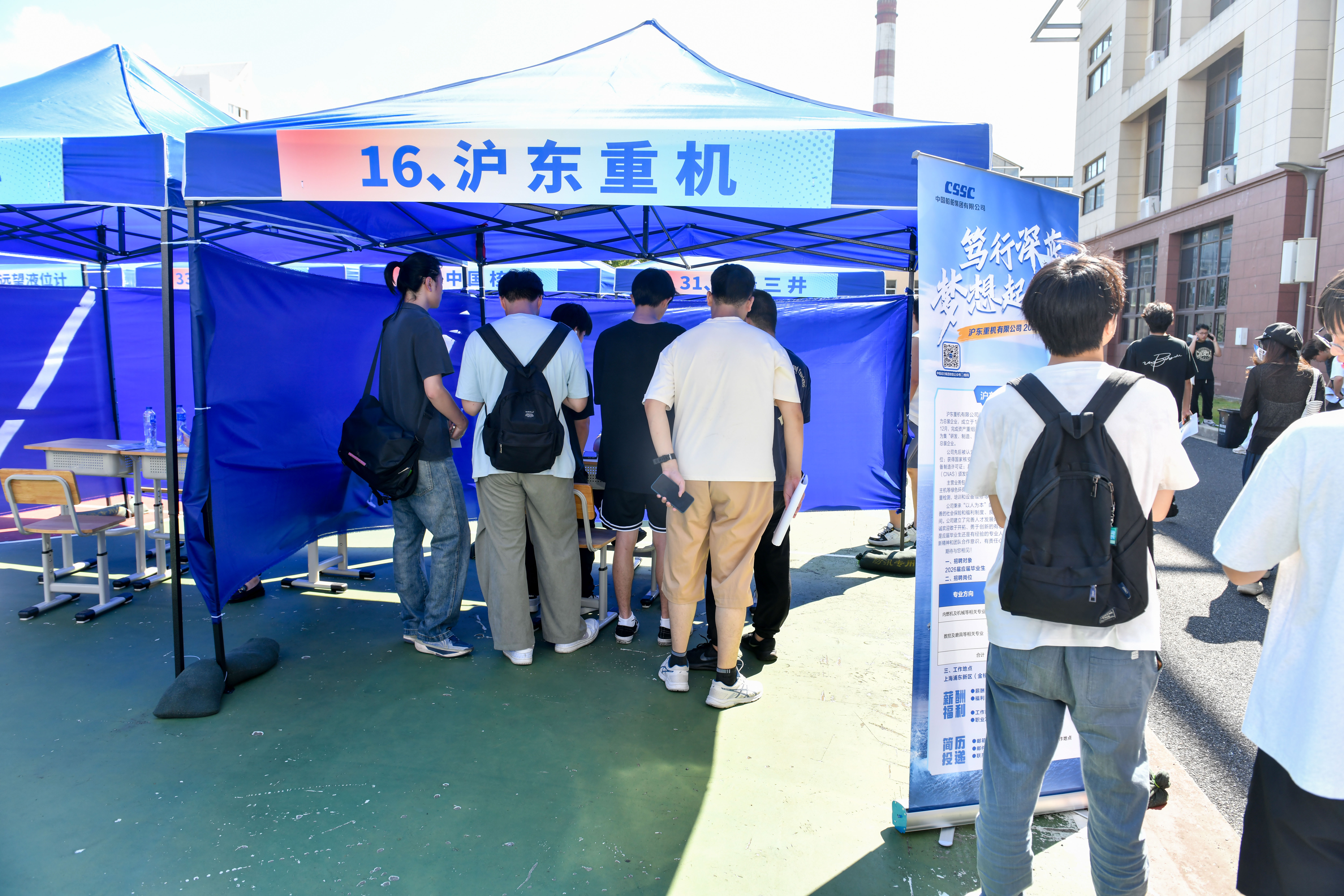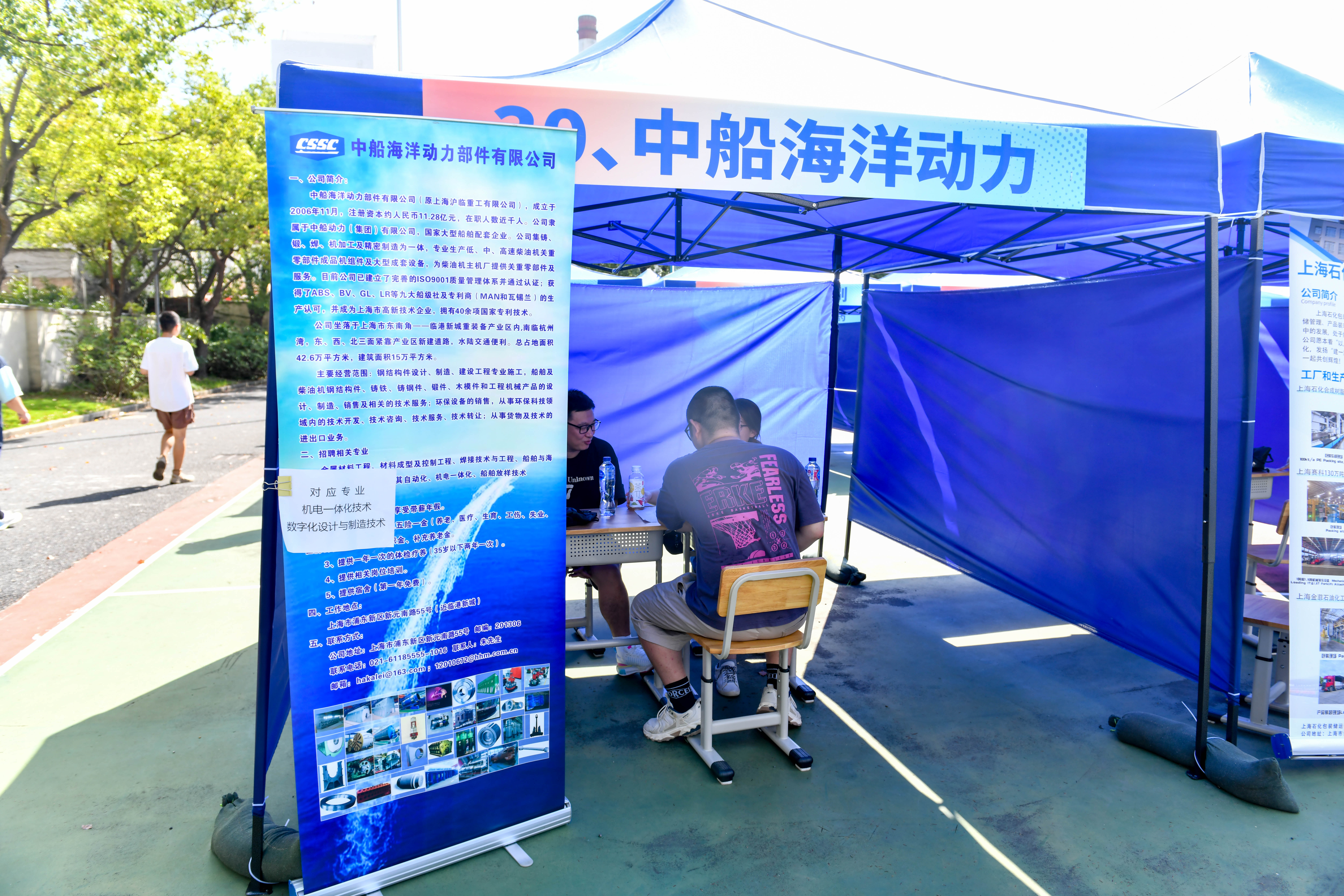 为深入贯彻落实国家促进高校毕业生就业的决策部署,全力搭建毕业生与用人单位高效对接的桥梁,10月17日下午,“职引未来筑梦青春”2026届毕业生大型校园综合招聘会在我校南校区篮球场隆重举办。作为我校首场面向高职毕业生的大型综合招聘会,本次活动吸引60余家企业参会,共提供176个岗位,计划招募1050余人,中国石化上海石油化工股份公司、科思创、上海航天设备制造总厂有限公司、宝武碳业科技股份有限公司等多家知名企业纷纷到场。