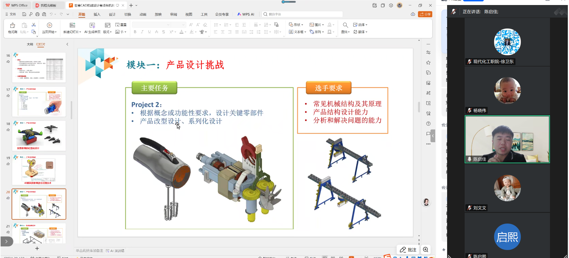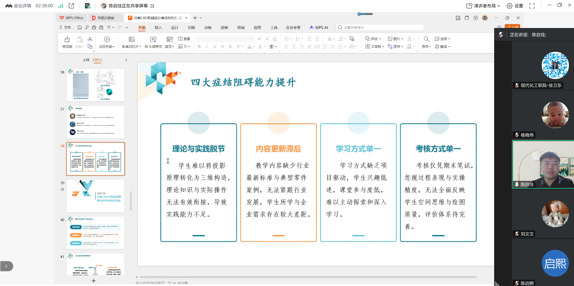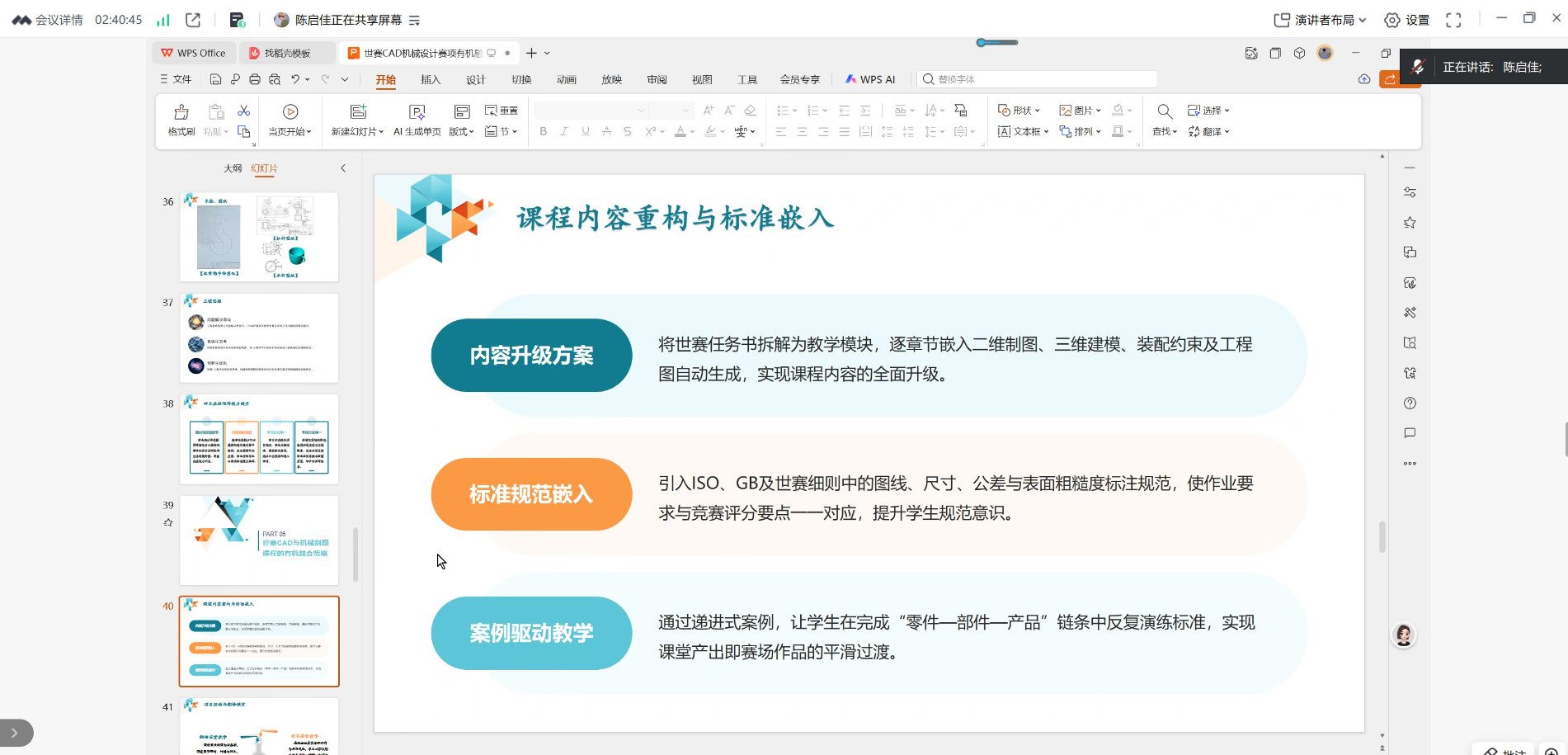 陈启佳老师从世界技能大赛宗旨、中国参赛历程、CAD赛项技术演进、评分标准四个维度展开,系统梳理了“技能奥林匹克”多年发展脉络,重点解读了CAD机械设计赛项“四天四模块”的竞赛流程及3D打印、三维扫描、激光切割等新技术的迭代应用。