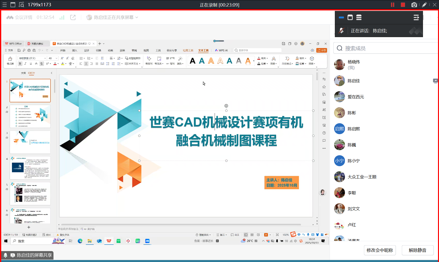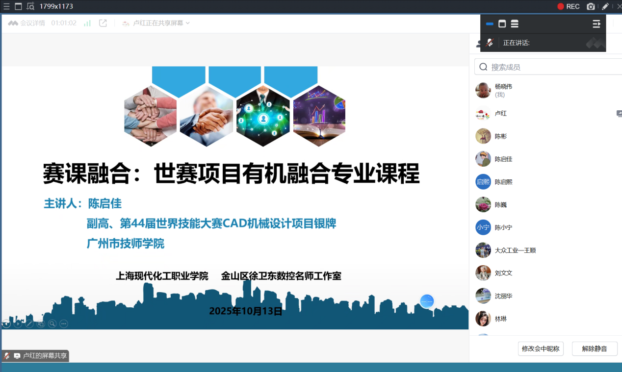 10月13日,金山区徐卫东数控名师工作室举办线上专题教研。第44届世界技能大赛CAD机械设计银牌得主、广州市技师学院陈启佳老师应邀作《世赛CAD赛项与机械制图课程融合》讲座,本次教研活动同时邀请了上海市大众工业学校数控技术应用专业的相关骨干教师参加,共10余名骨干教师云端参会。