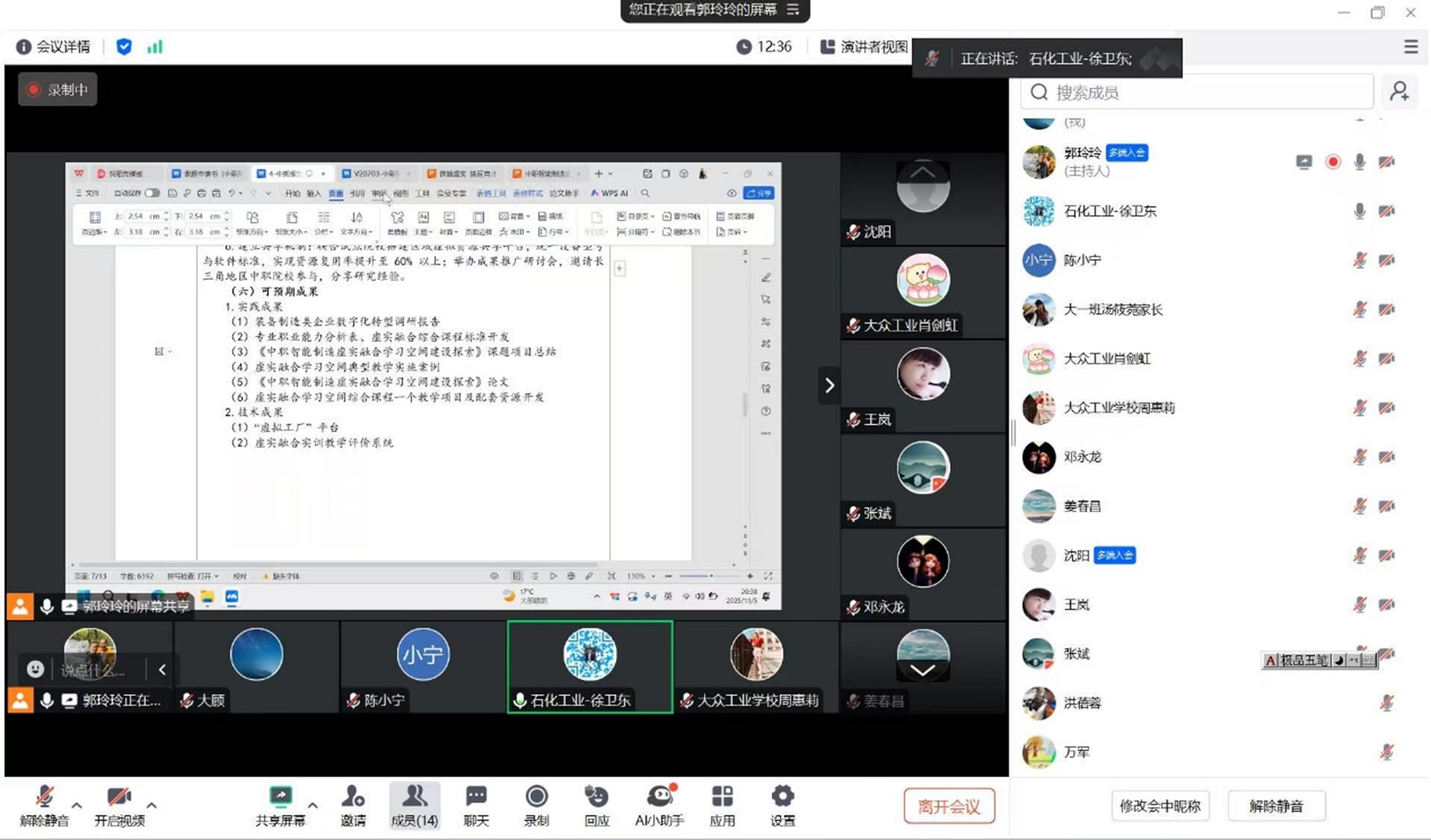 工作室主持人徐卫东指出虚实融合学习空间建设是职业教育数字化转型的关键突破点,课题的核心关键词是学习空间,那么最终的成果,要聚焦研究内容:构建了一个什么样的学习空间?虚实怎么融合的呢?空间的构建是怎么样组成的?。他强调,课题需进一步聚焦为什么建(破解传统实训高风险、高成本、低效性痛点)、建什么(构建数字孪生+实体验证双循环体系)、怎么建(开发模块化虚实融合教学资源包)三个核心命题,同时要将学生技能成长数据与企业用人需求精准对接,推动研究成果从校级试点向区域推广跃升。