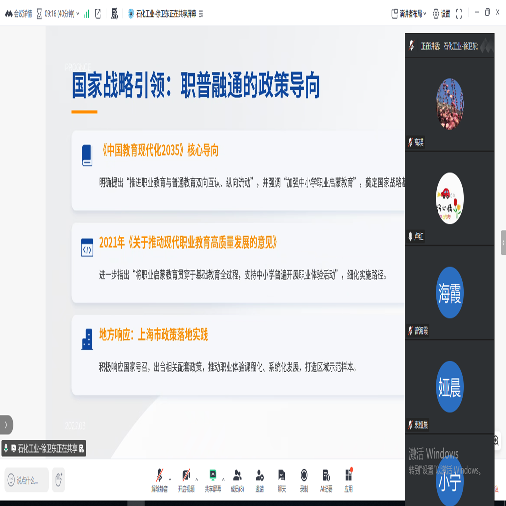 徐卫东就课题项目的背景与意义,国内外研究现状,研究内容、研究目标、研究思路和方法,项目的创新点、研究计划以及预期成果等内容进行了展示汇报,课题立足职普融通国家战略引领和政策导向,将职业启蒙教育贯穿于基础教育全过程,支持中小学普遍开展职业体验活动,着力培养中小学职业认知--职业定向--素养培养的现实需求。课题将搭建理论引领—课程开发—资源建设—评价反馈—机制保障”五位一体的系统化研究框架,帮助青少年树立正确的职业观、劳动观,努力实现职业体验从“活动化”到“课程化”的转型。