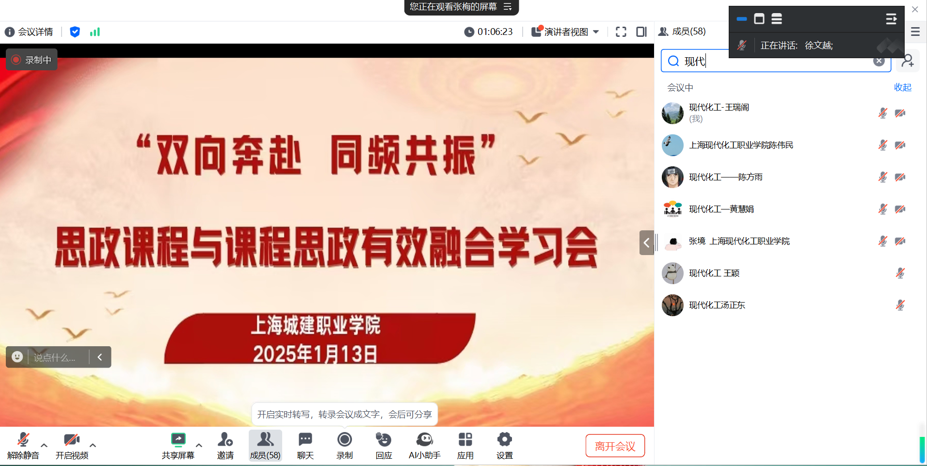 为进一步提升思政教育教学质量,探索思政课程与课程思政深度融合的有效路径,我校思政教师于1月13日参加了由结对马院上海城建职业学院马克思主义学院举办的思政课程与课程思政有效融合线上学习会。此次学习会吸引了上海多所兄弟院校的参与。