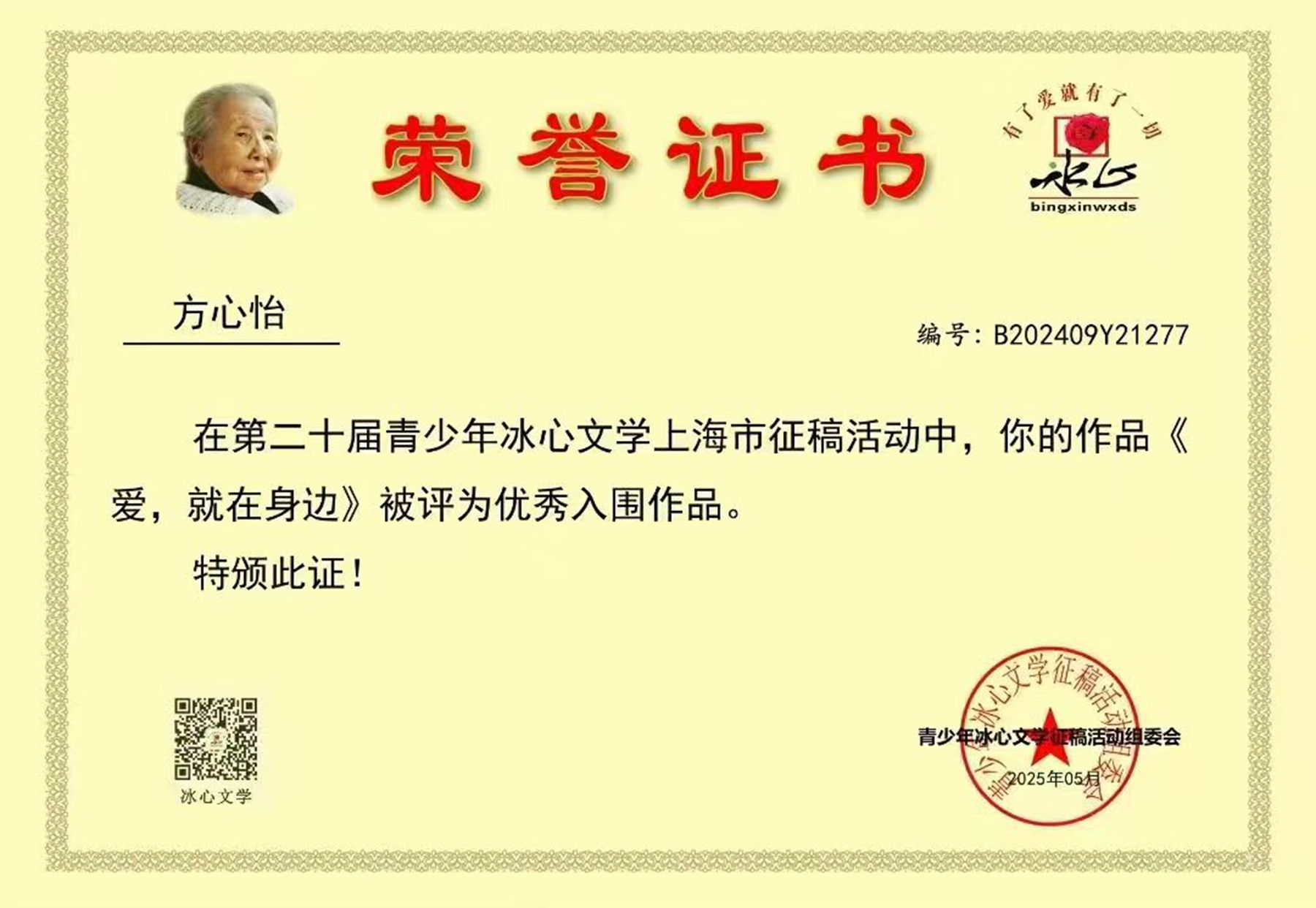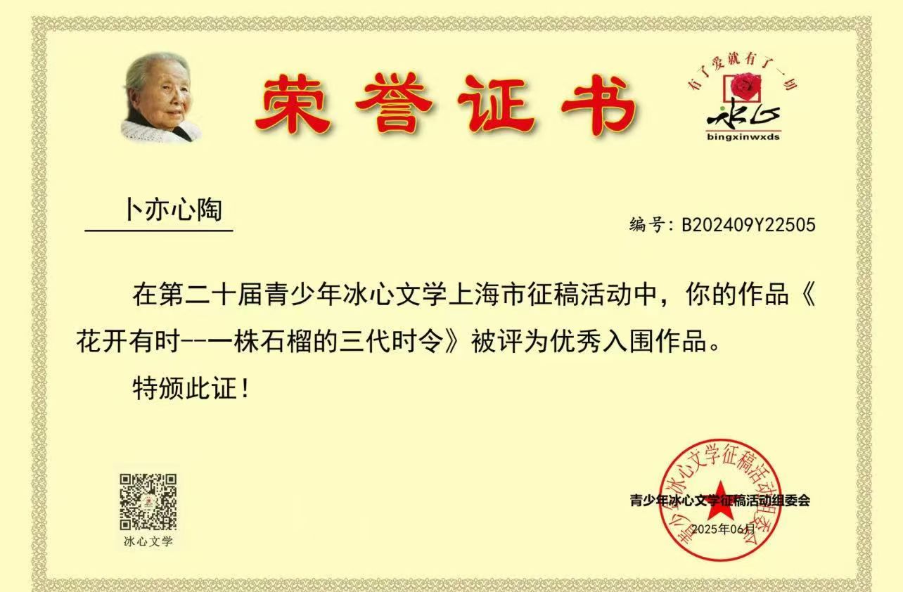 此外,我校方心怡与卜亦心陶两位同学也荣获“冰心杯”上海市优秀入围作品奖。