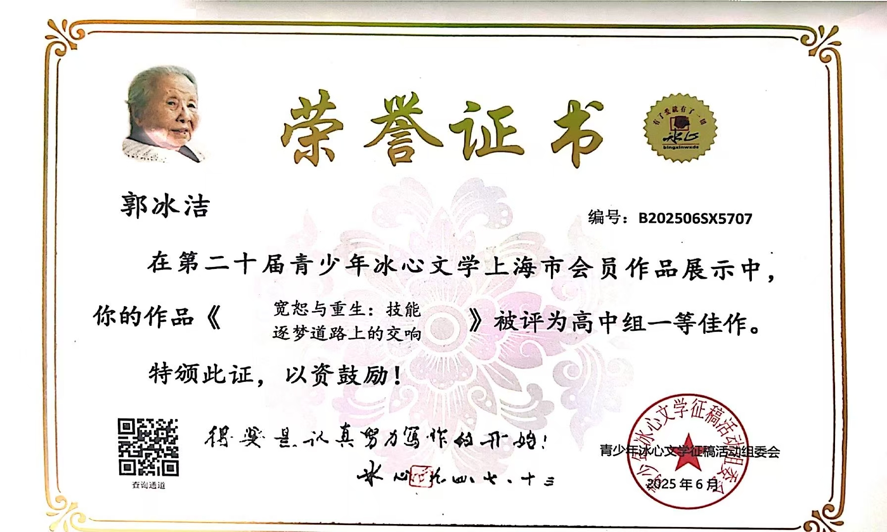 近日,我校五年一贯制学生郭冰洁的作品《宽恕与重生:技能逐梦道路上的交响》在第二十届青少年冰心文学上海市会员作品展示中斩获高中组一等佳作,这是我校在这一重要赛事中首次获奖。