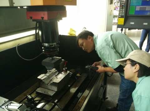 1121号到1125号,由叶师傅指导我们学习另外一种放电加工——电火花成型加工。他教会我们怎样去对刀,由于是成型加工,对完刀后就可以直接加工,所以叶师傅没有让我们动手加工。