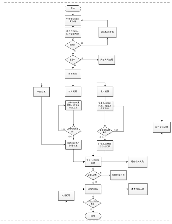 Ø 较大变更:信息中心制定变更实施、测试及恢复方案,并在测试系统中进行测试验证,验证通过后,交由运维小组执行变更。