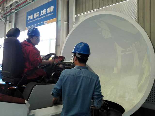 在徐工集团的技术人员陪同下,经贸科一行人在徐工集团员工技术培训中心及重型设备生产车间参观了虚拟仿真培训系统,该设备以虚拟仿真技术为基础,研发应用了最先进的半实物仿真培训平台,将起重机等重型驾驶设备的实物操控器,如驾驶舱等设备设施与计算机模拟的控制对象连接在一起进行培训。整个操作过程中及操作结果,均真实的呈现出虚拟仿真设备控制器的动态特性、静态特性和非线性因素等,这是一种更接近实际的仿真技术。这种虚拟仿真实训系统可以根据计算机模拟的天气状况、路面状况、意外状况、载货状况等不同情况来培训和考核学员的设备操作技能,从而改变现有的大型物流设备培训教学成本高,场地要求高,日常消耗大,安全要求高,培训周期长等中职教学培训的困境,使得教学培训可以实现易操作、更安全、效率高、成本低的效果。