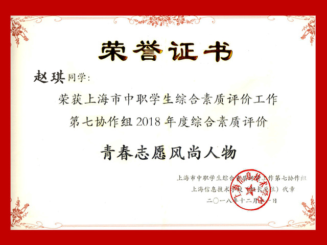 近期,我校庄俞、李晨、赵琪三位同学参加了在上海图书馆召开的“上海市中职学生综合素质评价第七协作组年度表彰会暨学生社会实践工作交流推进会”。三位同学荣获“上海市中职学生综合素质评价工作青春志愿风尚人物”荣誉称号。