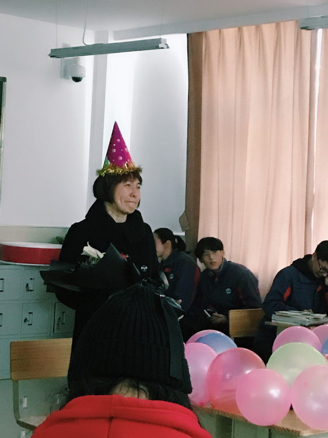 今天下午第三节课即将要上的时候,161旅游班的顾田甜来到了经贸二组的办公室,一脸有事地对高老师说:“老师,我们班的X同学肚子疼了,你去看看。”高老师一脸着急地说:“怎么回事?”高老师就这样被她的孩子们请进了教室,一进门高老师就收到了有11朵红玫瑰、5朵百合以及一些不知名的小花组成的一束鲜花——原来孩子们是给他们的班主任老师过生日呢——一个大大的惊喜哦!教室里布置得像迎接一个隆重的圣诞节似的,孩子们给高老师戴上了尖尖的生日帽,教室的中央是一个气球的海洋,老师被孩子们簇拥在这个海洋的中心,教室里的大屏上播放着孩子们精心录制的视频,伴随着悠扬婉转的音乐声,一个个可爱、率真的孩子,道着一声声祝福与感恩的话语,我们的高老师凝望着大屏咬着嘴唇、嘴角的酒窝深深地被定格如同这神圣的一刻,感动的泪在眼眶里转着圈。“我们曾经捣过多少蛋,给您舔过多少麻烦,让您失望过,让您伤心过,也让您开心过。我们可能不是您带出的最优秀的一届,但我们一定是最能让您记得住的一届。”田甜那甜美笑容与字字如珠的话儿一定会被根植于每一个在场人的心田。“相信这一届学生一定会有出息!”这是高老师对我说的话。