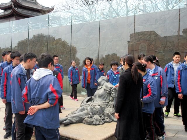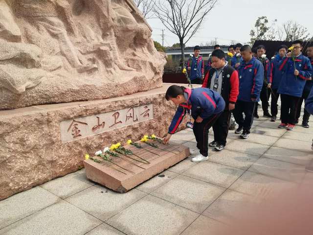 此处遗址纪念园是以当年侵华日军登陆上海的地点为址修建起来的建筑,提醒人们世世代代不忘侵略者的罪行。站在雕塑前,同学们都静静默哀,为先烈们献上鲜花。之后,基地讲解员带领大家仔细走访了园内每处角落,耐心地解说每一个历史纪念品背后的故事。许多雕塑和史物,都深刻反映了当时中国军民尤其是金山地区军民顽强对抗日本侵略者时的丰功伟绩。