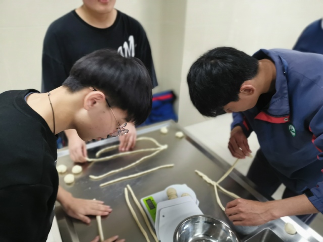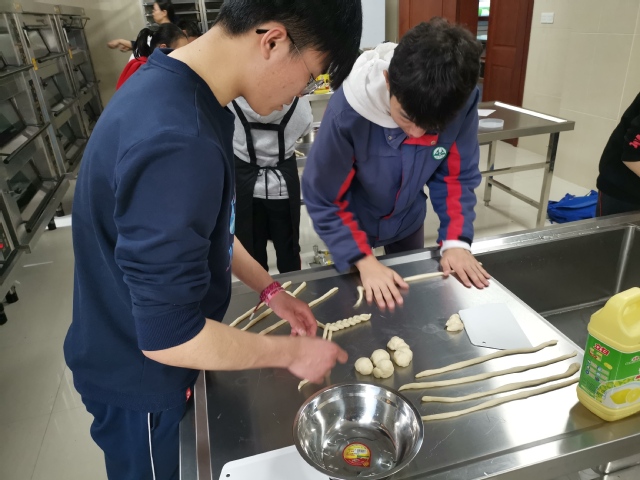 今天社团活动制作的内容是辫子面包。辫子面包因它的外形而得名。社员们按照老师的要求,将每一个面包的材料分成了三个小面团,将小面团搓成均匀的三根长面条,像编麻花辫一样给面包编辫子。社团里大部分都是女孩子,编麻花辫自然不是问题,可这简单的编法难倒了没编过辫子的男生们。在老师手里听话的长面条到了他们手里竟变得无处安放,他们有些将面包做得又细又长,有些直接束手无策向老师求助。在老师的指导下,男生们最终完成了辫子面包的制作放入醒发箱醒发并烤制。