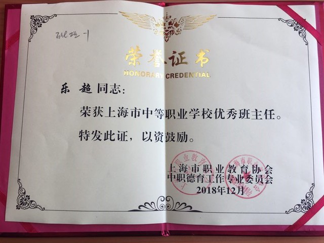 近日,接到上海市职业教育协会《关于表彰上海市中等职业学校优秀班主任的通知》,我校乐超老师被评为2018上海市中等职业学校优秀班主任,本次活动由上海市职业教育协会中等职业学校德育专委会负责评选工作,经各级教育行政部门、各行业集团和有关学校推荐,专家评审,网上公示,全市有35名老师评为“上海市中等职业学校优秀班主任”,予以表彰,并颁发荣誉证书。