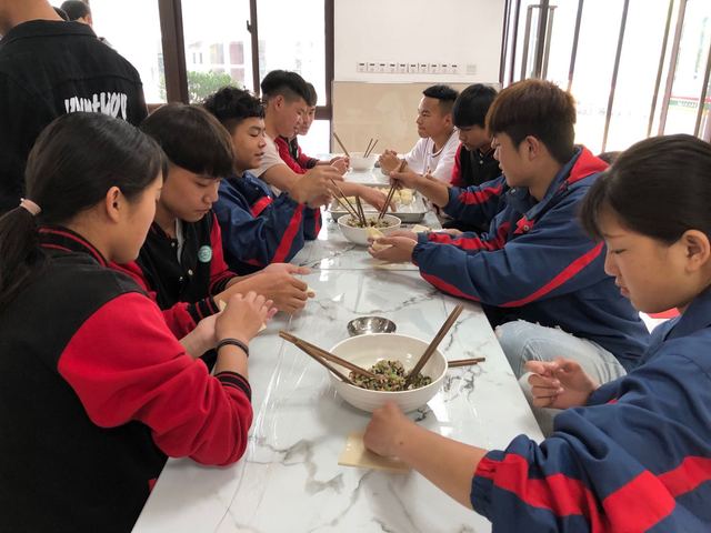 上午,机电专业两个班学生在南区食堂包馄饨,在老师们的指导下学生们慢慢学会了这项技能,馄饨的模样越来越漂亮。化工和经贸两个班学生在北区实训楼学习西点制作,掌握了羊角面包的基本制作方法,一个又一个羊角面包做出来了,烤箱里弥漫出的香味让大家觉着饥肠辘辘。在活动中,每位学生脸上洋溢着笑容,他们在制作食品中体会劳动的乐趣,掌握生活的本领。午餐吃着自己包的馄饨、做的点心,师生们欢笑一堂。