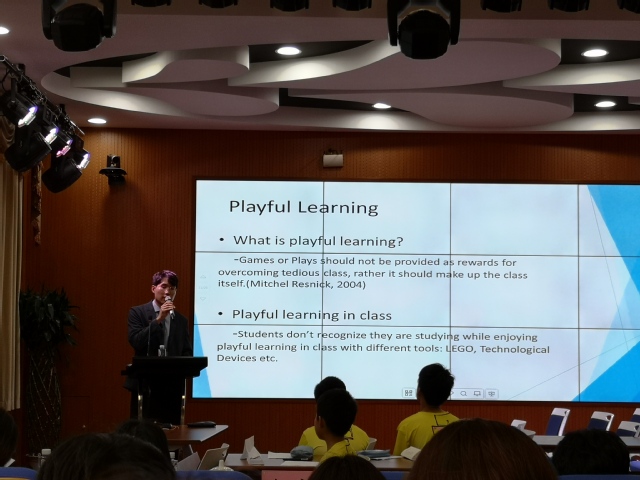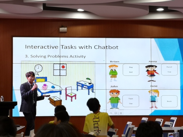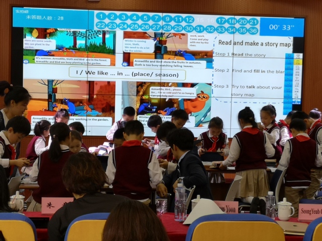 本次活动有两个中心环节:一是观摩林玲老师带给大家的运用人工智能的不一样的课堂教学,二是聆听韩国小学英语教育协会代表团成员Seong Yeub Chu所作的人工智能在英语教学中的实践的讲座。