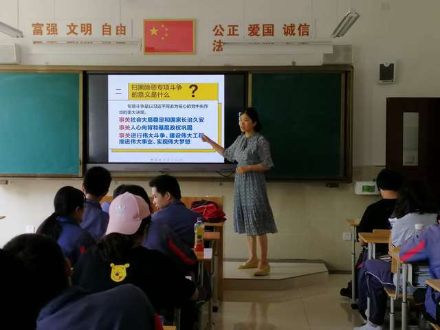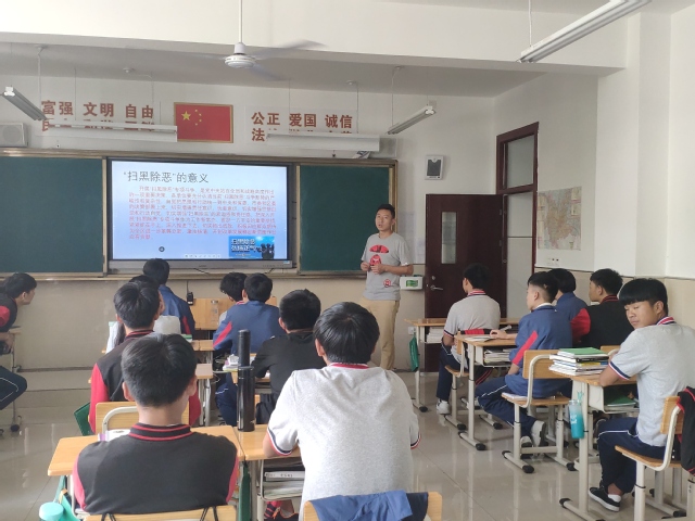 在给同学们普及扫黑除恶知识的同时,鼓励大家积极营造扫黑除恶的舆论氛围,主动参与、善于发现、勇于检举揭发,坚决杜绝校园欺凌,也要学会用法律知识保护自己。