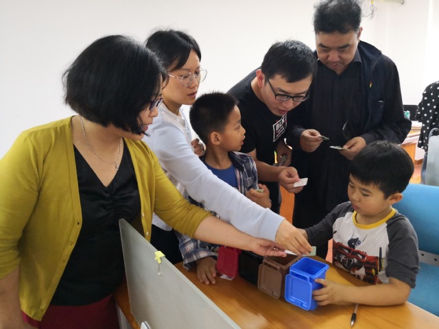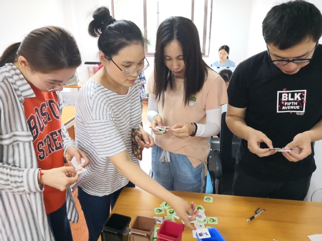 为了增加活动的趣味性,分工会提前准备了垃圾分类的小道具——黑色、棕色、蓝色和红色共4个迷你垃圾桶和108张印有日常生活垃圾的卡片。大家先一起学习了垃圾分类的四分法,了解了常见的生活垃圾大致归类,接下来组员们摩拳擦掌,垃圾快速分类小游戏正式开始:先由每组派出的代表随机抽取20张卡片(代表着20类生活垃圾),然后在规定时间内将这20类垃圾投放到相应垃圾桶,准确率最低者将“奖励”一次下班前对所在办公室进行垃圾分类的“机会”。一场“你追我赶、你分我辨”的垃圾快速分类小游戏“上线”了!