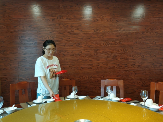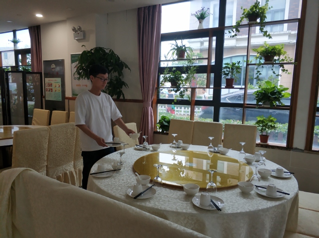 为了全面地掌握酒店各个岗位的工作,老师们分组实践,在多个重要岗位进行了轮岗工作。主要的实践岗位有:迎宾服务、领位服务、前台服务(包含电话订餐、网络接单和收银等)、餐厅服务(包含中餐摆台、点单、上菜、斟酒等)、宴会服务等。我校与上海多家高星级宾馆校企合作多年,旅游专业和商务英语专业均有学生选择餐饮服务行业作为实习和就业的岗位。因此,两个教研组的老师结合自己专业的实际情况和学生就业需求,在实践过程中抓重点,学难点。旅游专业教师侧重于掌握餐厅服务的技能要点,特别是中餐摆台和上菜的礼仪习惯;商务英语专业教师侧重于学习迎宾和前台服务,主要是电话订餐和网络接单工作。在整个学习过程中,企业制度的规范性和公开性给老师们留下了深刻的印象。例如,在餐饮单位制度方面与时俱进,直接采用扫描二维码浏览文件内容的形式,将《餐饮单位食品安全和诚信自律承诺书》、《废弃物处置制度》、《食品安全自查和报告制度》等文件呈现给来客。