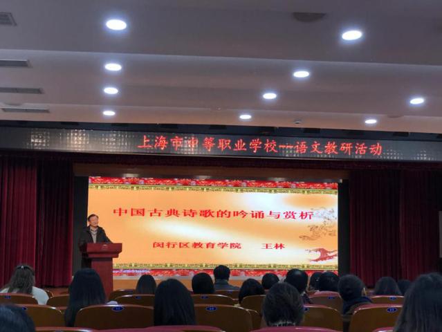 此次教研活动一共有两项内容。第一项是由闵行区教育学院的王林教授带来的一堂关于中国古典诗歌的吟诵与赏析的课程。王教授以“诗歌与音乐的关系”为切入点,带领在座的各位教师回顾了从《诗经》到唐宋时期的代表诗歌与音乐的关系,点明中国古典诗歌大多可以“和乐而歌”的特征。除此之外,王老师还吟唱了李白、杜甫、李清照等著名诗人、词人的代表作,在场的各位教师纷纷为之鼓掌,并同王教授一起吟唱,感受中国古典诗歌的魅力。