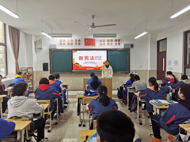 各班班主任为学生介绍了宪法知识——宪法的性质、地位、作用以及学习宪法的意义。宪法是一个主权国家或地区的具有最高法律效力的根本大法,是治国安邦的总章程,是党和人民意志的集中体现,是制定其他法律的依据。