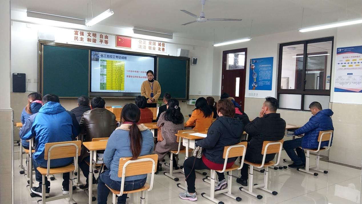 两位班主任首先就本学期开学以来学生的总体表现做了说明,肯定和表扬了班级中表现良好的同学;随后就学生目前的学习情况展开,对本次化工总控工考试情况及本学期期末考试成绩做了分析和说明,要求成绩不理想的学生家长要配合学校和老师,平日里加强督促,帮助学生提高学习成绩。三年级是专业课学习和相关考证的关键阶段,学生要明确自己未来的发展方向,制定合理的学习目标,取得化工总控工中级证书,努力学好专业课,完善自身知识储备,备战AHK第二阶段的考试。