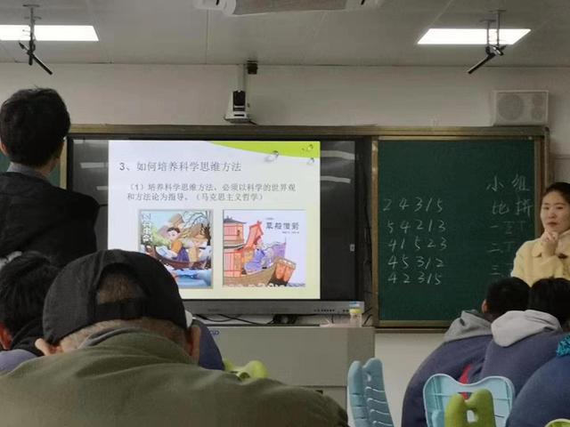 其次,董老师通过一则有趣的案例《鞋厂推销员的故事》,启发学生思考“人生发展能否缺少科学思维”,引导出科学思维的含义。紧接着,董老师分别通过播放两段视频《蔡伦造纸》与《中国达人秀——刘伟》的故事,深入启发学生思考科学思维对于我们认识世界和健康成长有何重要作用,学生们以小组为单位深入探讨这一问题。根据学生回答,董老师进行总结归纳科学思维对人类社会发展的巨大作用。最后,董老师通过引导学生为大家讲解《刻舟求剑》与《草船借箭》的故事,从故事本身出发,引导学生认识到培养科学思维,需要以科学的世界观、方法论为指导,提高学生在实践中培养科学思维的能力。